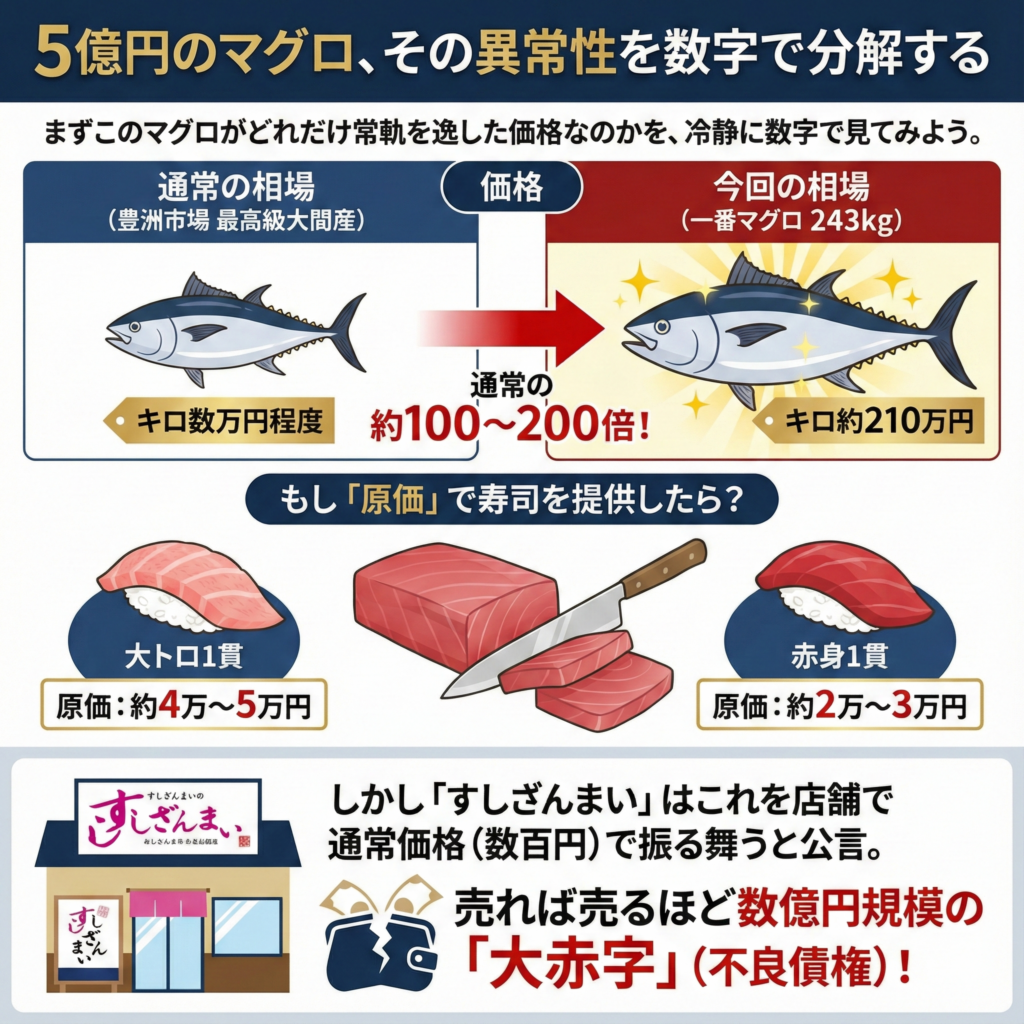 まずこのマグロがどれだけ常軌を逸した価格なのかを、冷静に数字で見てみよう。