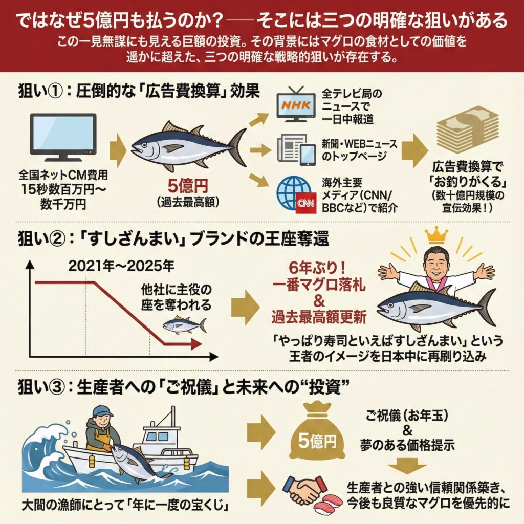 - 6年ぶりとなる今回の一番マグロ落札、そして自らが持っていた過去最高額の大幅な更新。これは「やっぱり寿司といえばすしざんまい」という王者のイメージを、日本中の人々の脳裏に強烈に再刷り込みするための執念の5億円だったと言えるだろう。