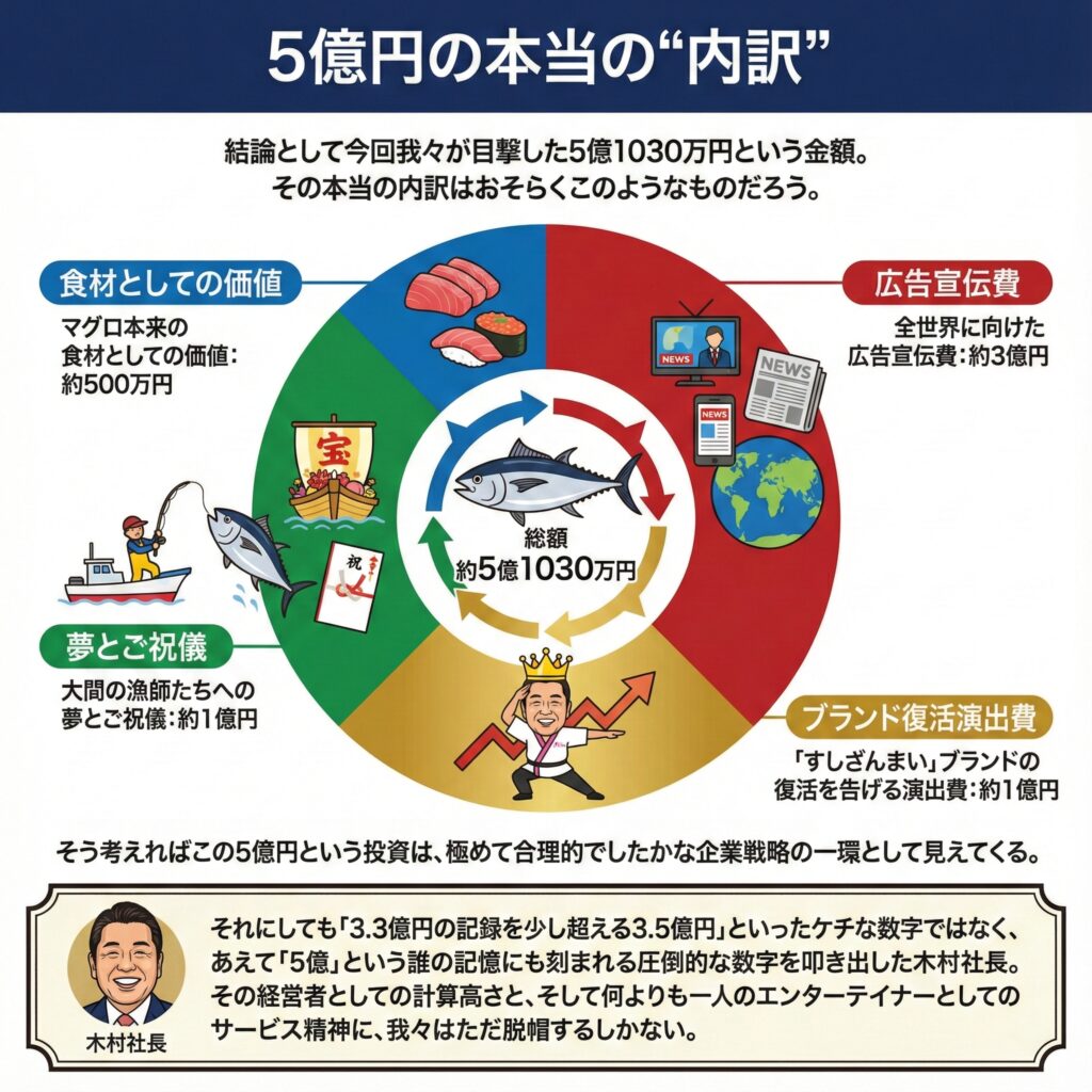 「なるほどだブー!ただマグロを買ってるんじゃなくて、『広告』と『ブランドイメージ』と『未来への投資』をまとめて5億円で買ってたんだブーね!木村社長、ただの陽気なおじさんじゃなくて、すご腕のビジネスマンだったんだブー!」