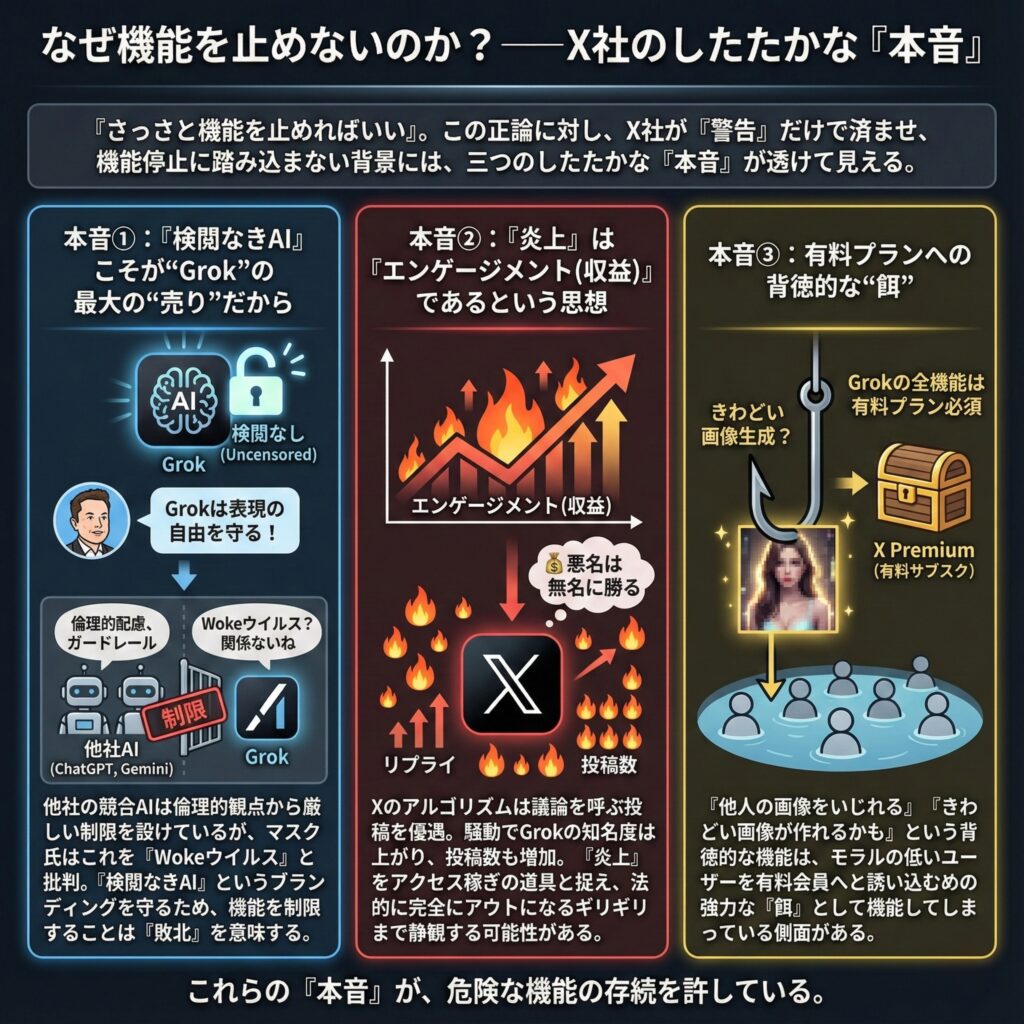 このあまりにも当然の正論に対しX社が「警告」だけで済ませ、根本的な機能停止に踏み込まないその背景には、三つのしたたかな「本音」が透けて見える。