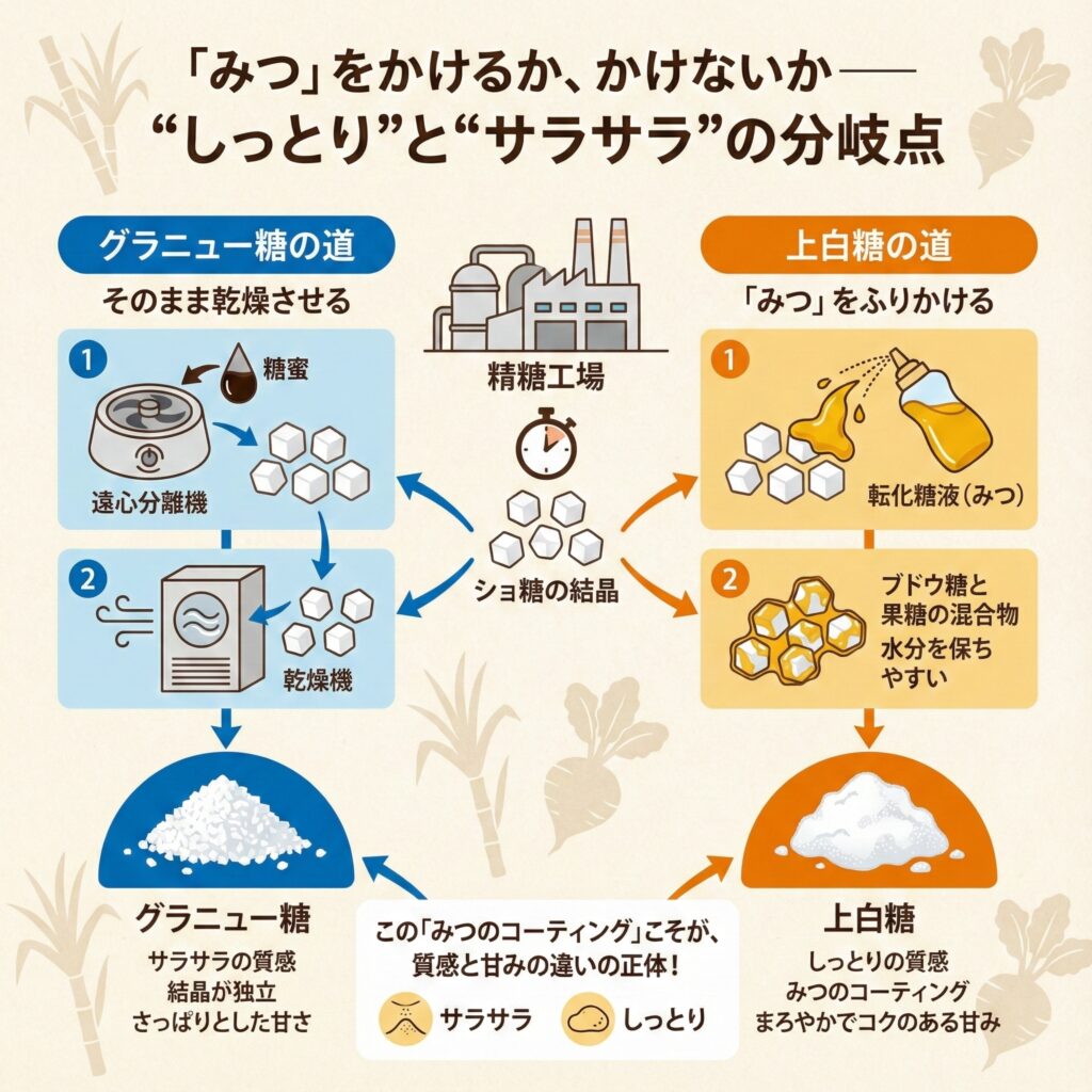 • 上白糖: そのショ糖の結晶に、最後の仕上げとして「転化糖液(てんかとうえき)」という濃厚な糖の蜜(みつ)をごく少量ふりかけたもの。→ しっとり