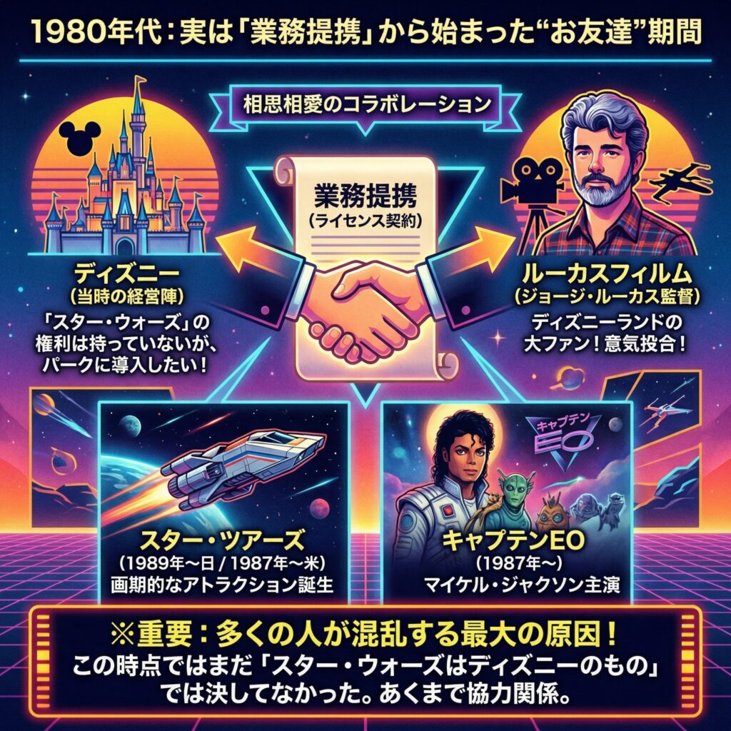 - 昔(スター・ツアーズ時代): ジョージ・ルーカスとディズニーが「仲の良い友人同士」としてコラボレーションしていた。