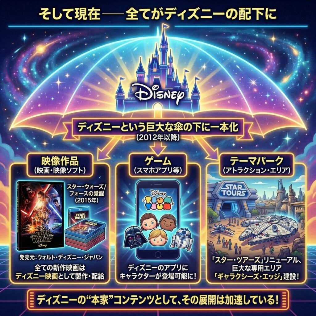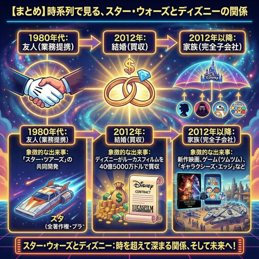 - 今(ツムツム・新作映画時代): ディズニーがルーカスフィルムを丸ごと買収し「正式に結婚して同じ名字(ディズニー)になった」。