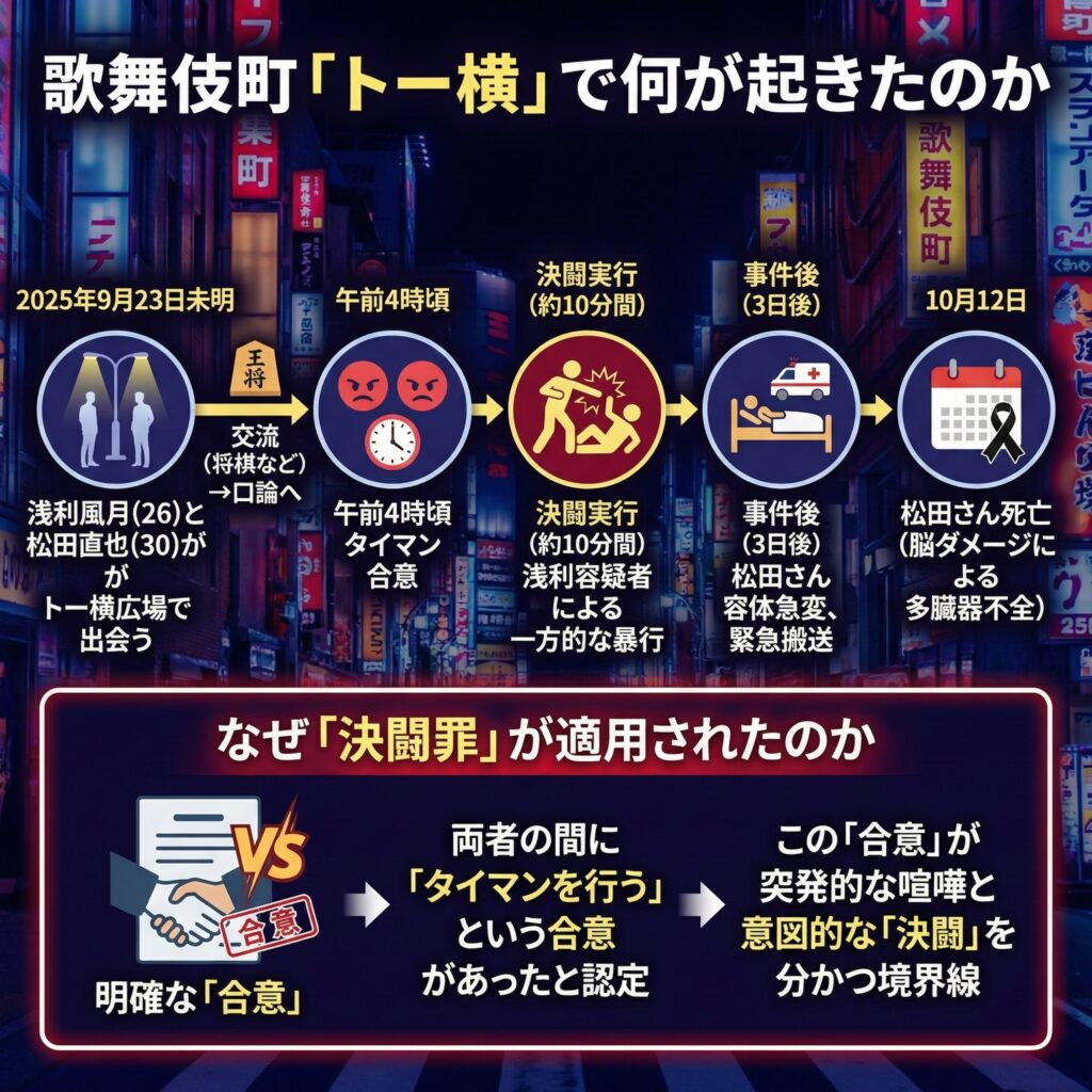 - 2025年9月23日未明: 浅利風月(ふづき)容疑者(26)と松田直也さん(当時30歳)が、歌舞伎町の「トー横広場」で初めて出会う。