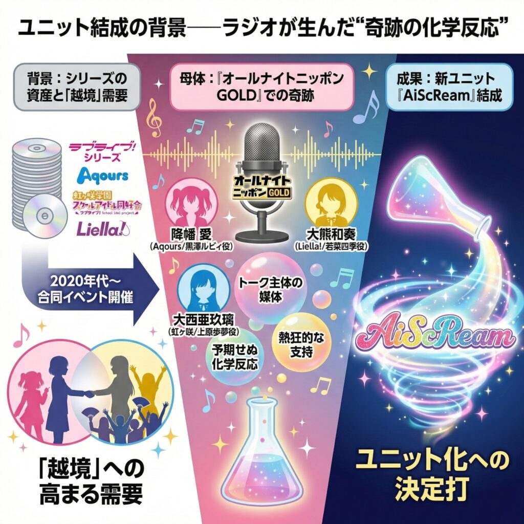 この現象の震源地は『ラブライブ!シリーズ』から突如として生まれた、作品の垣根を越えた「越境ユニット」、AiScReam(アイスクリーム)