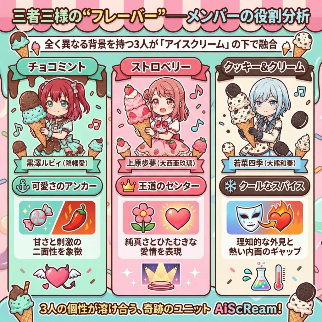 AiScReamの魅力の源泉は、全く異なる背景を持つ3人のキャラクター(およびキャスト)が「アイスクリーム」という共通項の下で融合した点にある。
