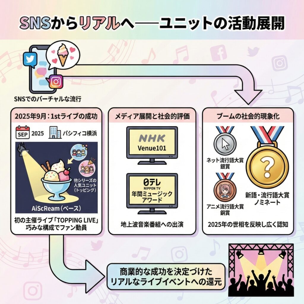 AiScReamの活動はSNSでのバーチャルな流行を、リアルなライブイベントへと還元することで商業的な成功を決定づけた。