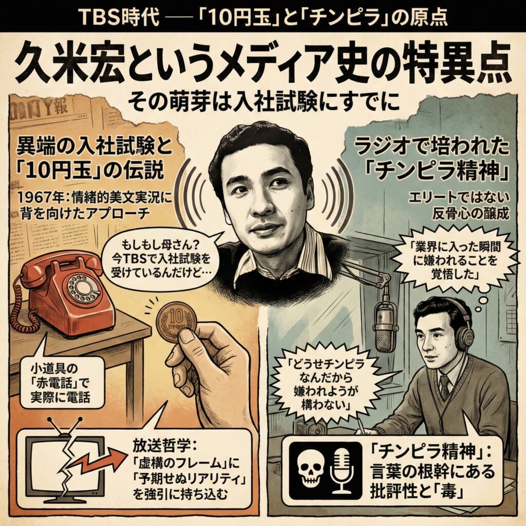 久米宏というメディア史の特異点は、TBSへの入社試験の時点ですでにその萌芽を見せていた。