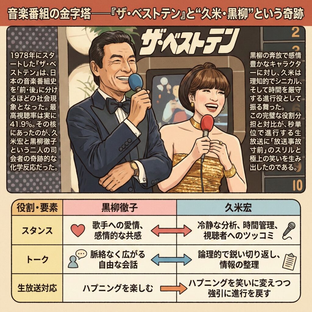 1978年にスタートした『ザ・ベストテン』は、日本の音楽番組史を「前・後」に分けるほどの社会現象となった。最高視聴率は実に41.9%。その核にあったのが、久米宏と黒柳徹子という二人の司会者の奇跡的な化学反応だった。