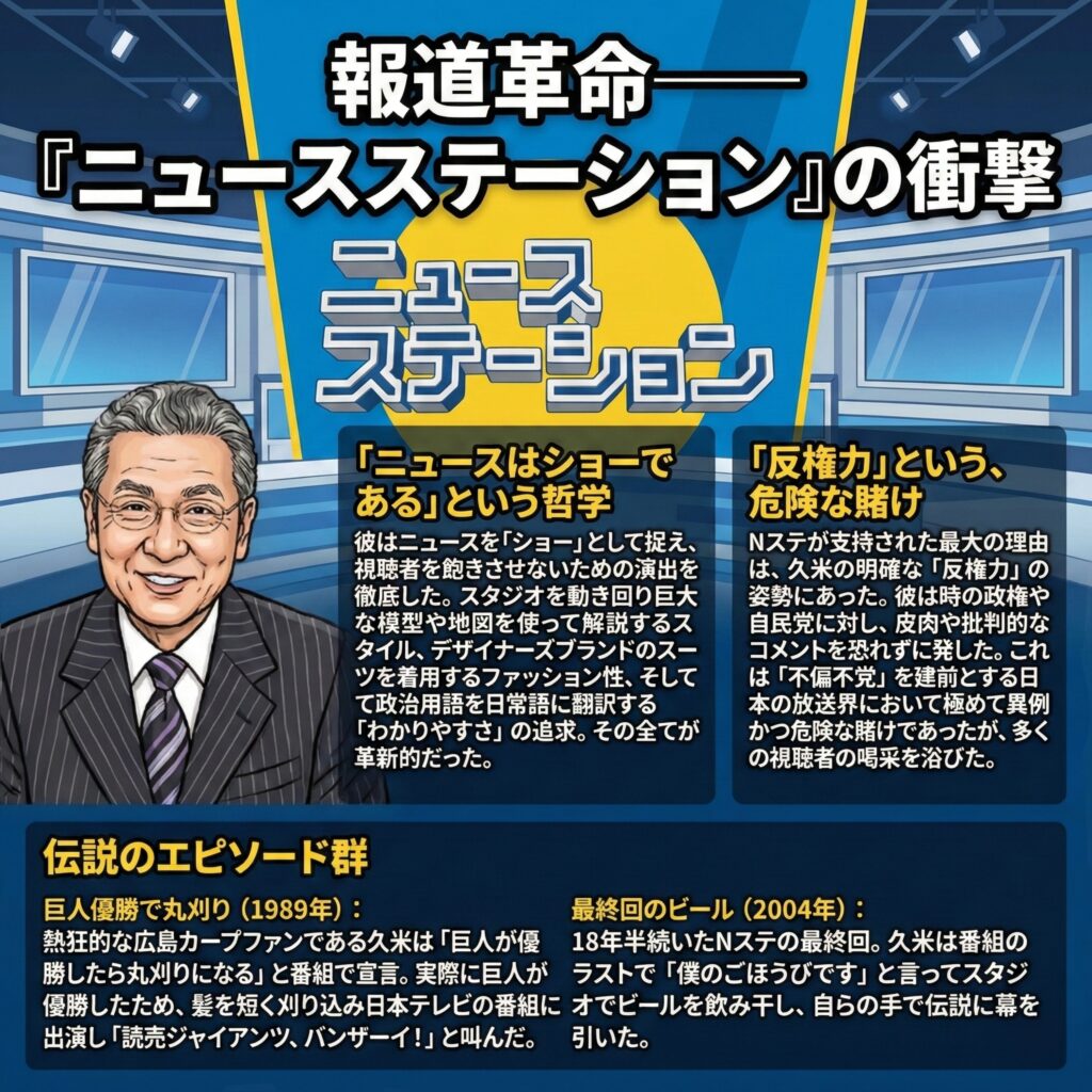 1985年10月、テレビ朝日で始まった『ニュースステーション(Nステ)』は日本のジャーナリズム史における革命であった。それまでのニュース番組が「厳粛に、客観的に、原稿を読み上げる」ものであったのに対し、久米はこの不文律を根底から破壊した。