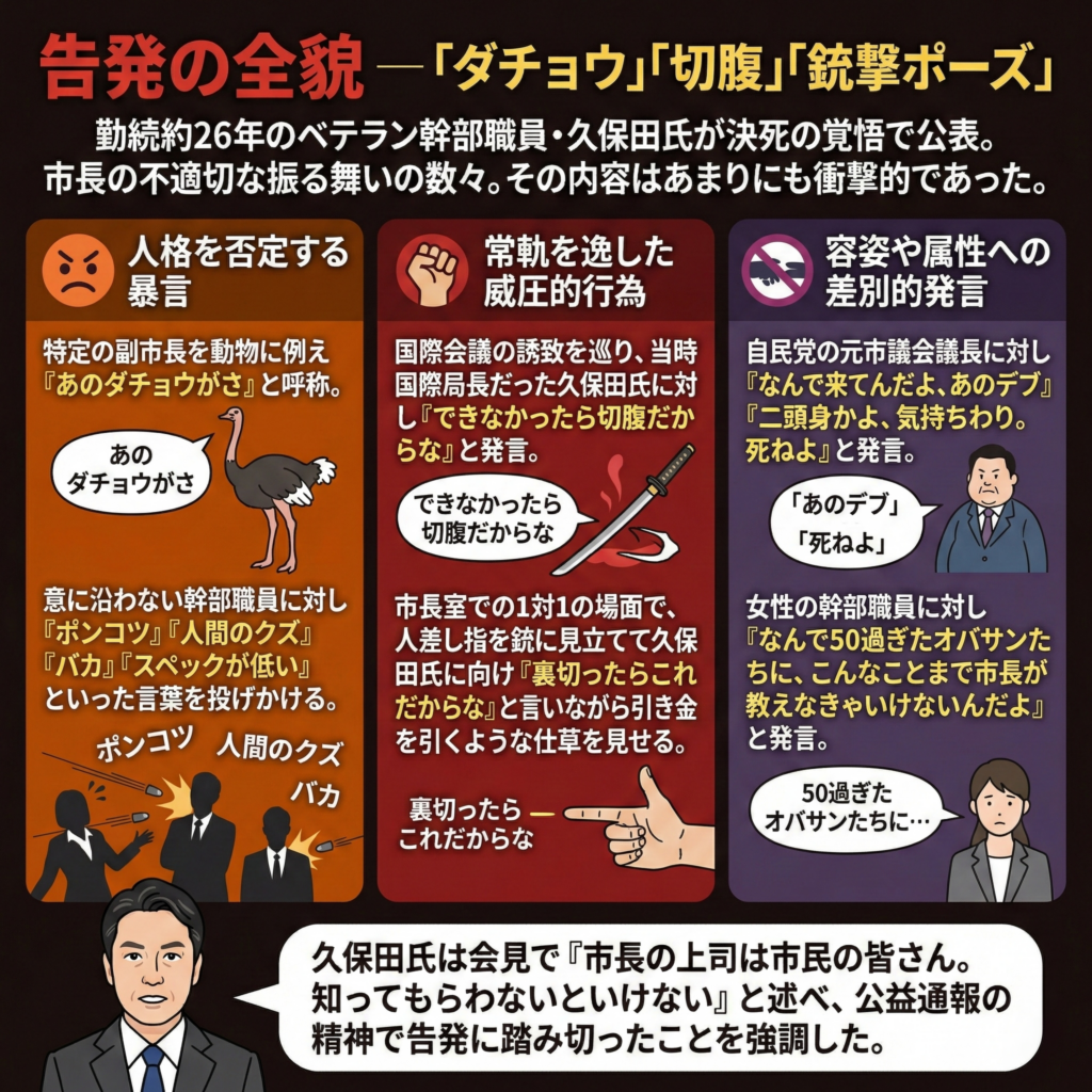 勤続約26年のベテラン幹部職員である久保田氏が決死の覚悟で公表した、市長の不適切な振る舞いの数々。その内容はあまりにも衝撃的であった。