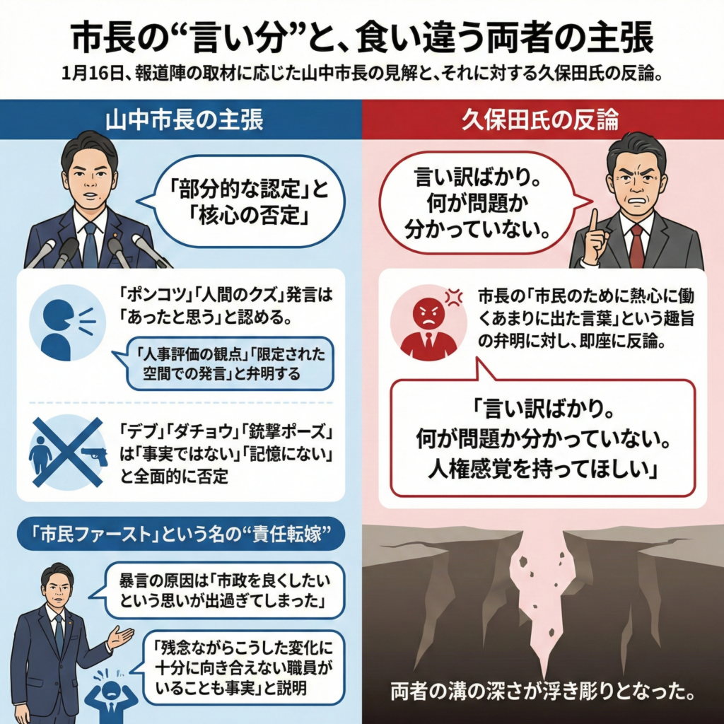 1月16日、報道陣の取材に応じた山中市長は一連の疑惑に対し自身の見解を述べた。しかしその説明は告発者である久保田氏の怒りをさらに増幅させる結果となった。