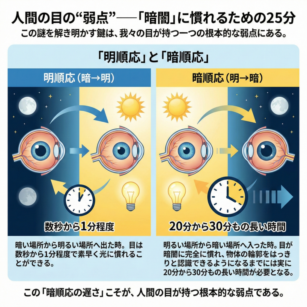 - 暗順応(明→暗): 明るい場所から暗い場所へ入った時。目が暗闇に完全に慣れ、物体の輪郭をはっきりと認識できるようになるまでには実に20分から30分もの長い時間が必要となる。