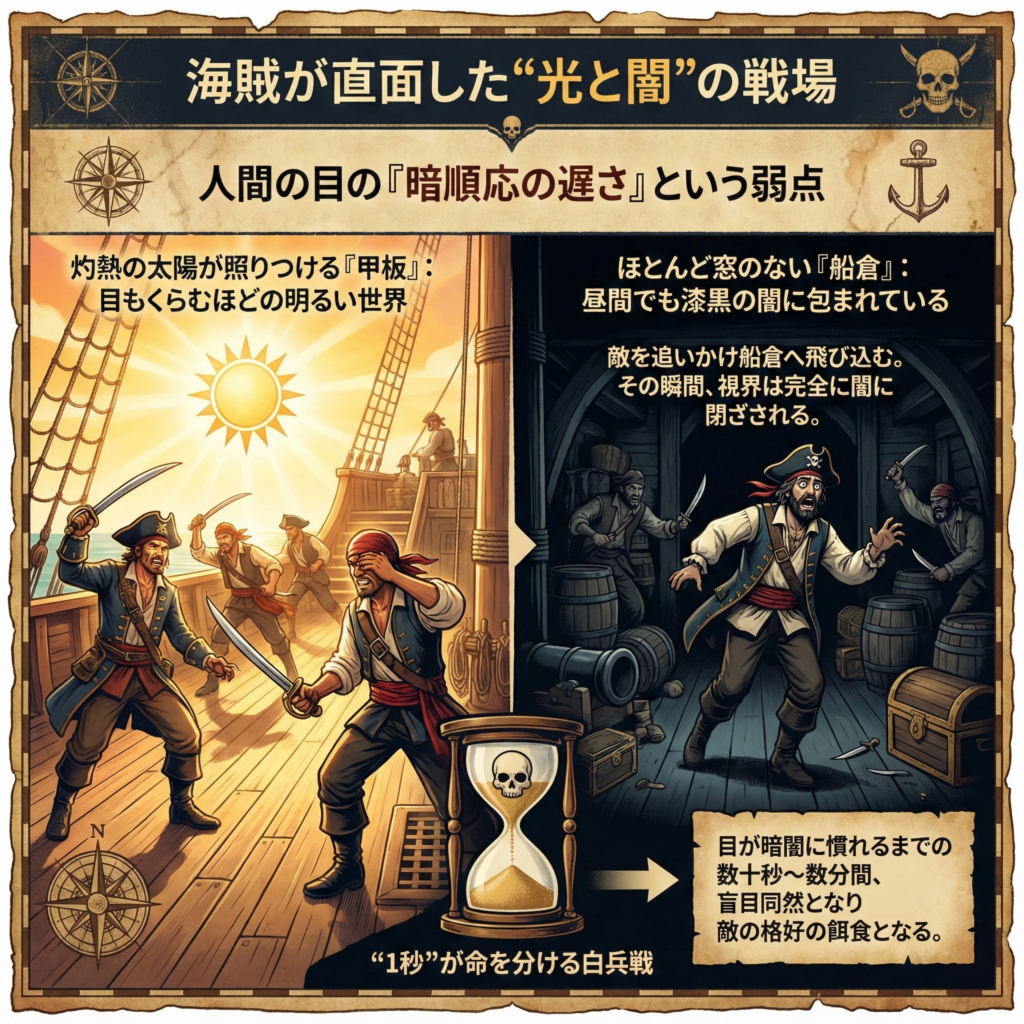 この人間の目の「暗順応の遅さ」という弱点は、海賊たちの日常そして戦闘において文字通り“致命的”な問題であった。