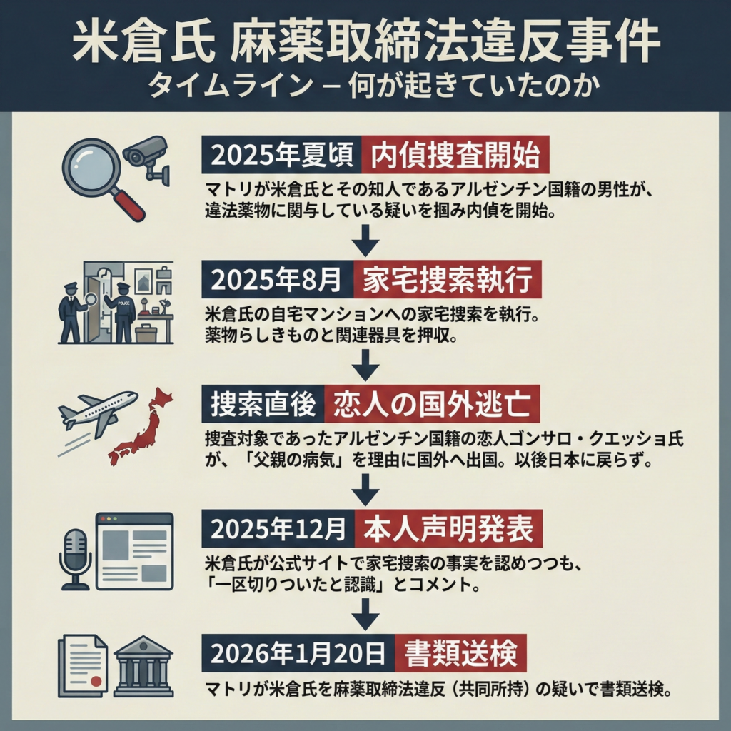 | 2026年1月20日 | 書類送検 | マトリが米倉氏を麻薬取締法違反(共同所持)の疑いで書類送検。 |