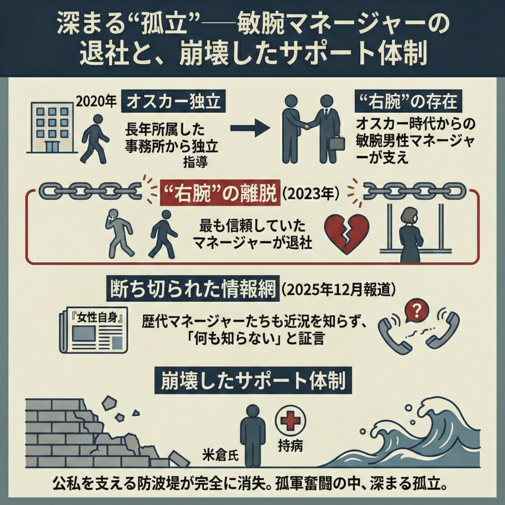 - 2025年12月の『女性自身』の報道によれば、米倉氏の歴代マネージャーたちでさえ彼女の近況を知らず、今回の騒動についても「何も知らない」と語っているという。