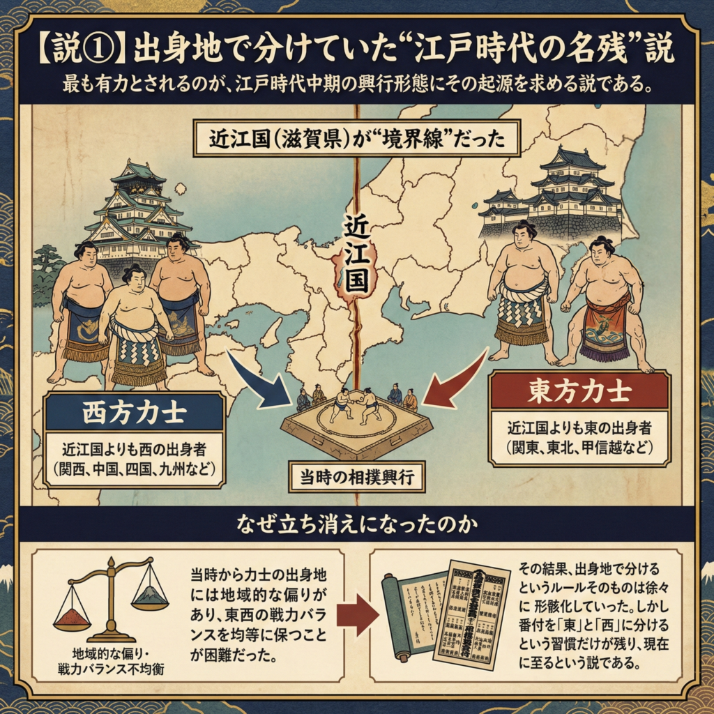 - その結果、出身地で分けるというルールそのものは徐々に形骸化していった。しかし番付を「東」と「西」に分けるという習慣だけが残り、現在に至るという説である。