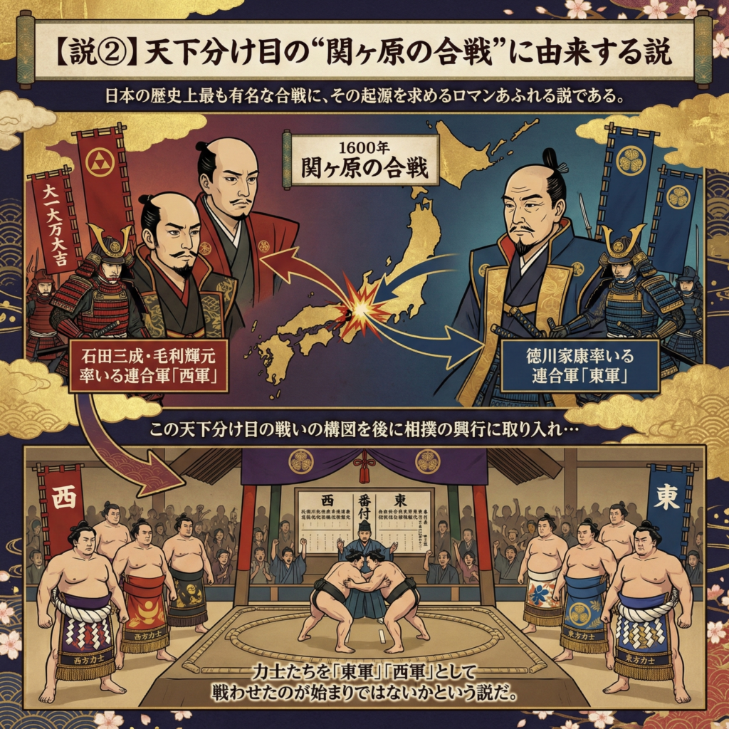 この天下分け目の戦いの構図を後に相撲の興行に取り入れ、力士たちを「東軍」「西軍」として戦わせたのが始まりではないかという説だ。