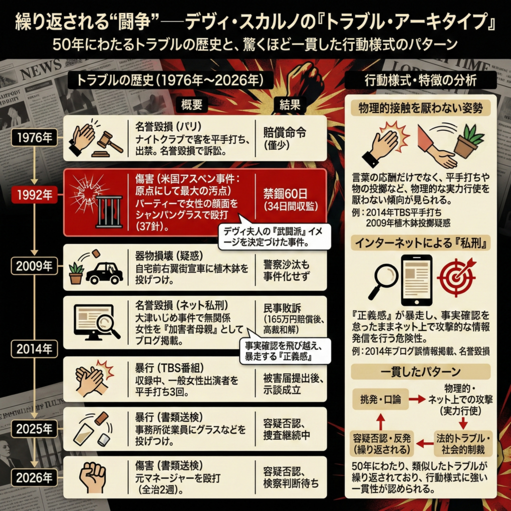 1976年のパリでの訴訟沙汰から1992年の米国アスペンにおける傷害事件、そして数々のインターネット上での炎上に至るまで、デヴィ夫人のキャリアは常に「権威」と「闘争」、そして「法廷」と共にあった。