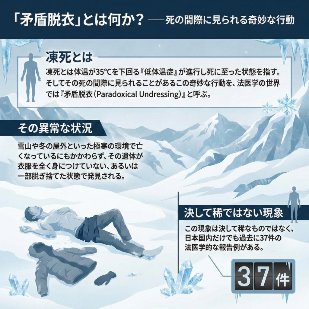 凍死とは体温が35℃を下回る「低体温症」が進行し死に至った状態を指す。そしてその死の間際に見られることがあるこの奇妙な行動を、法医学の世界では「矛盾脱衣(Paradoxical Undressing)」と呼ぶ。