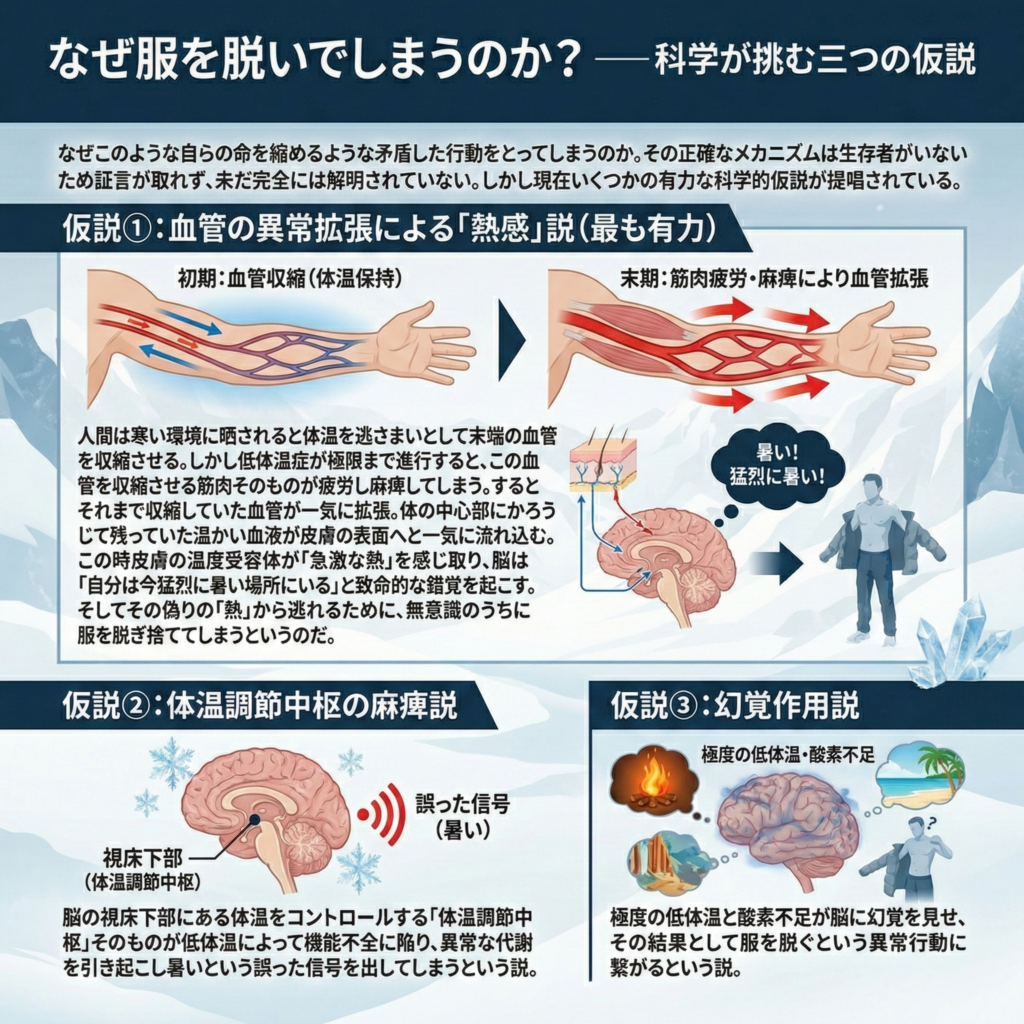 • 極度の低体温と酸素不足が脳に幻覚を見せ、その結果として服を脱ぐという異常行動に繋がるという説。