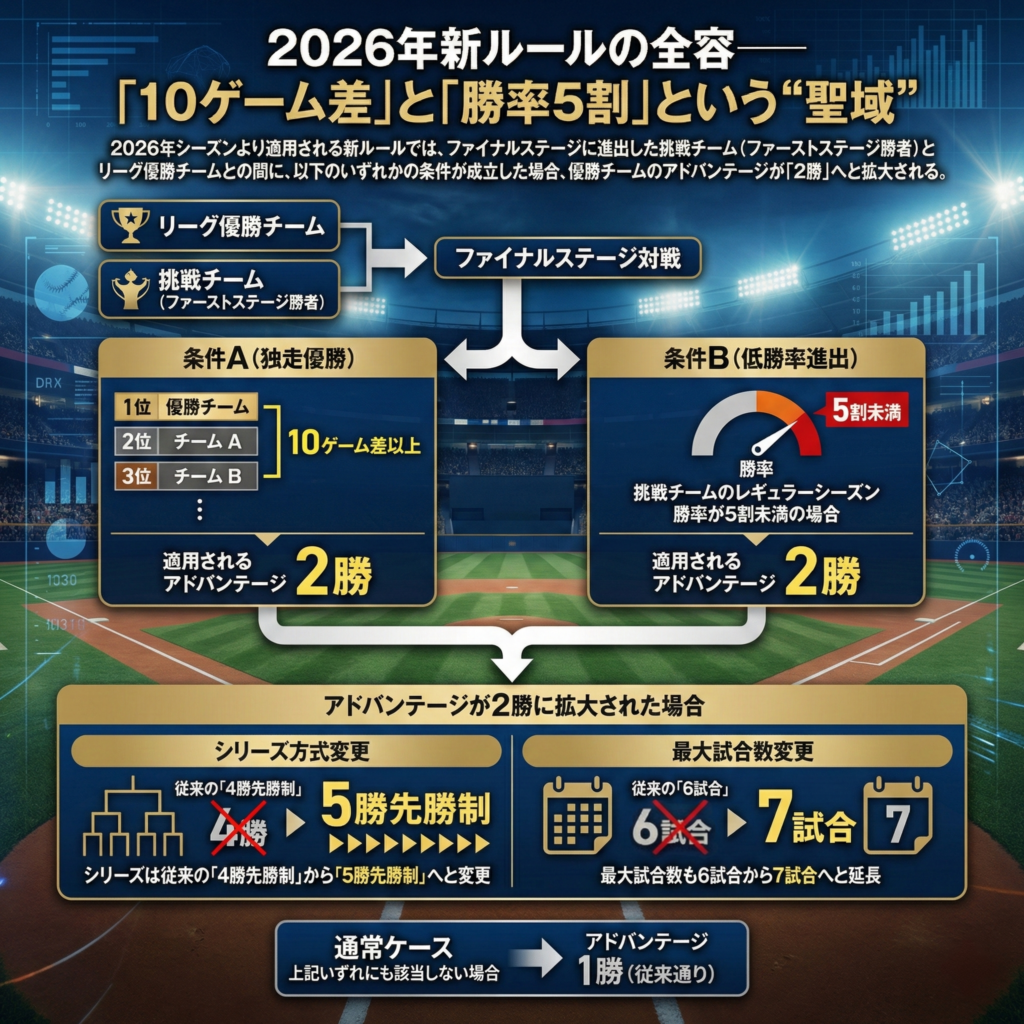 2026年シーズンより適用される新ルールでは、ファイナルステージに進出した挑戦チーム(ファーストステージ勝者)とリーグ優勝チームとの間に、以下のいずれかの条件が成立した場合、優勝チームのアドバンテージが「2勝」へと拡大される。