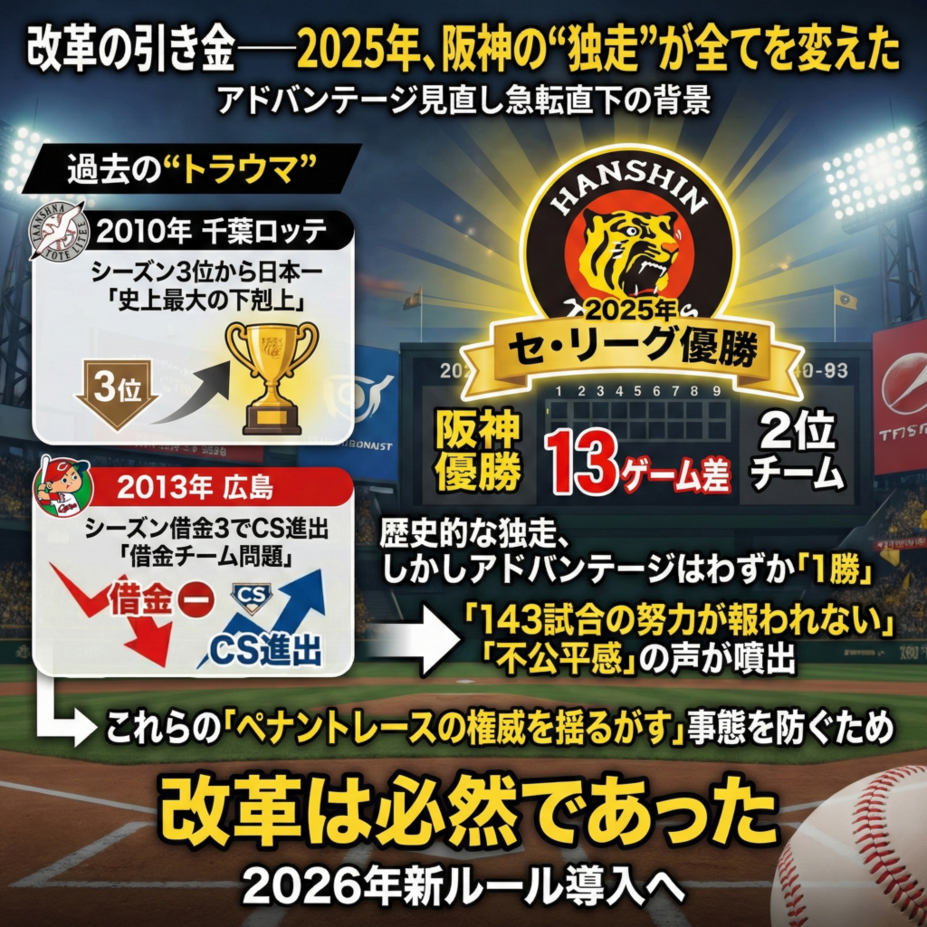 本稿は、この新ルール導入に至った背景、その直接的な引き金となった昨シーズンの「阪神独走」、そして過去の「下剋上」の歴史を踏まえ、この改革が今後のプロ野球にどのような影響を与えるのかを解き明かすレポートである。