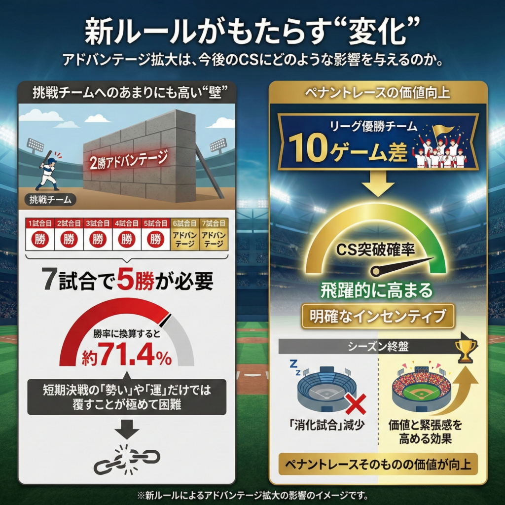 CSファイナルステージにおいてリーグ優勝チームに与えられるアドバンテージを、特定の条件下で従来の「1勝」から「2勝」へと拡大するという、抜本的な制度改革である。