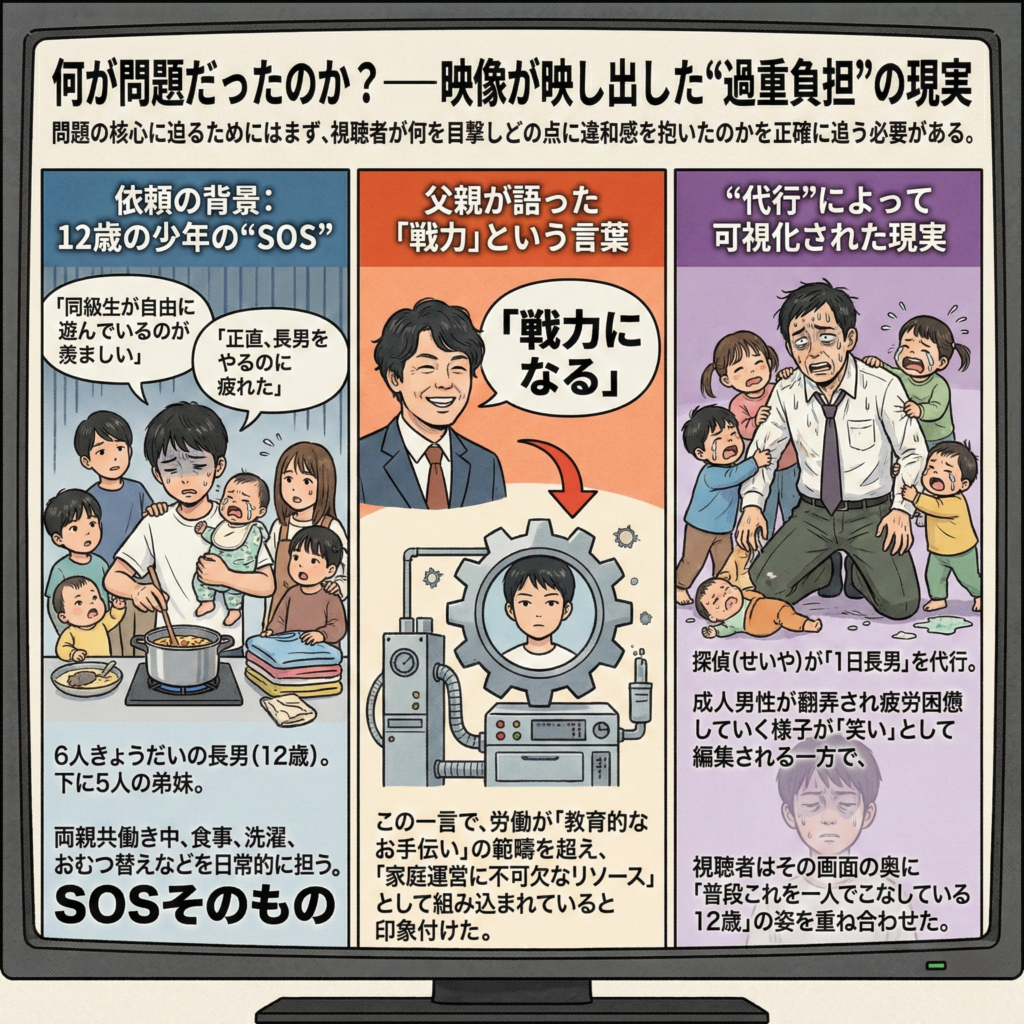 - 探偵である霜降り明星のせいやが「1日長男」として家事育児を代行するプロセスこそが、皮肉にも事態の深刻さを可視化させた。成人男性であるせいやが5人の子供たちの世話に翻弄され疲労困憊していく様子が「笑い」として編集される一方で、視聴者はその画面の奥に「普段これを一人でこなしている12歳」の姿を重ね合わせたのである。