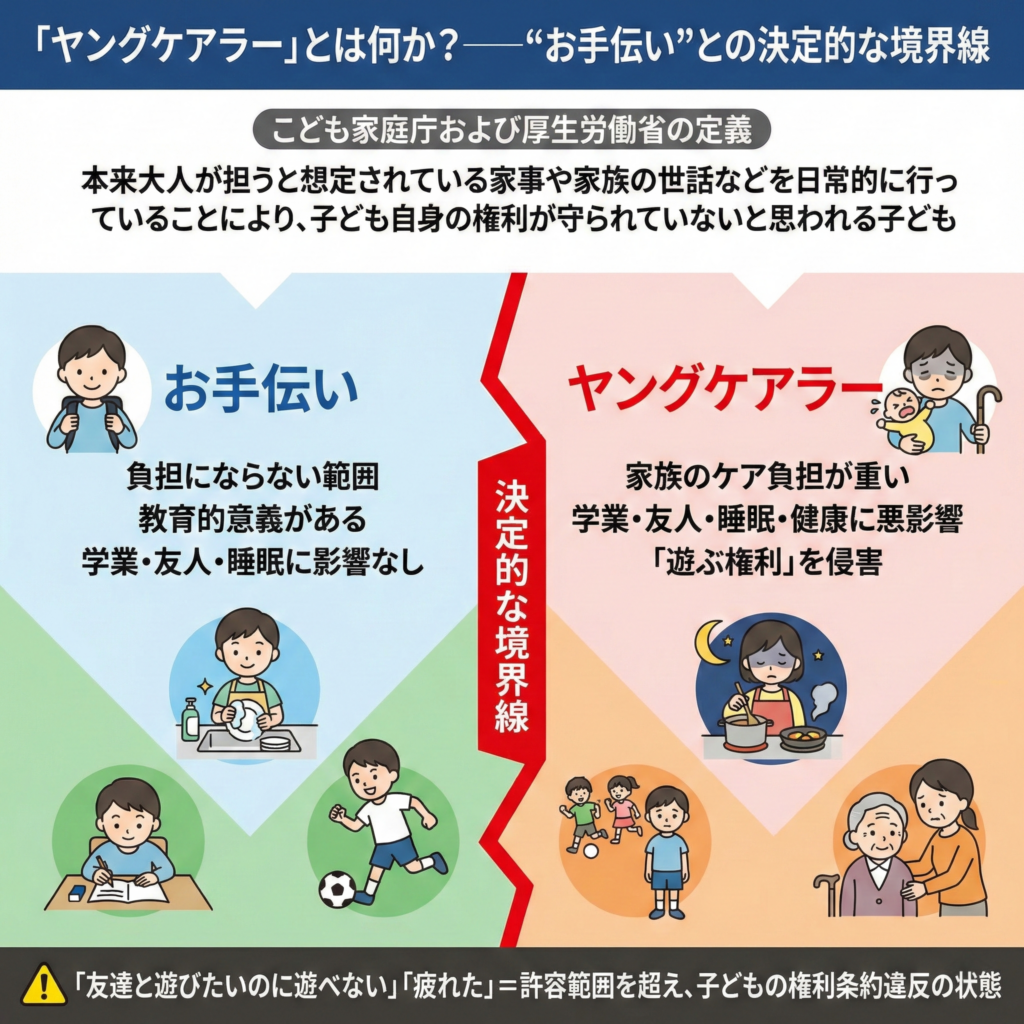 - 児童福祉の専門的見地から「お手伝い」と「ヤングケアラー」の境界線は明確に存在する。