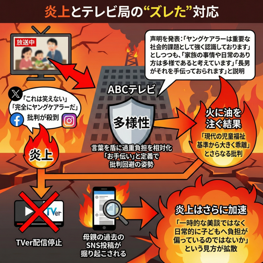 放送中からSNSでは「これは笑えない」「完全にヤングケアラーだ」といった批判が殺到した。この炎上に対しABCテレビは異例の声明を発表したが、その内容は火に油を注ぐ結果となった。