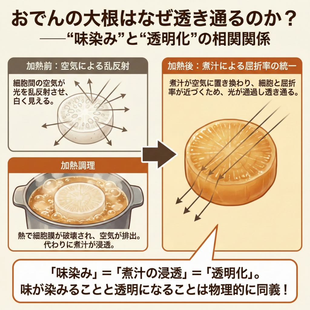 • これこそが、煮込んだ大根が「透明(半透明)」に見える科学的な理由である。つまり、「味が染みる(煮汁が入る)」ことと「透明になる」ことは、物理的に同義なのである。