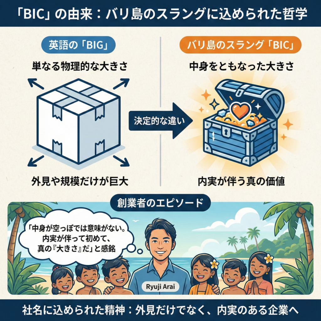- バリ島スラングの「BIC」: 創業者が現地で耳にした言葉には、「中身をともなった大きさ」というニュアンスが含まれていた。