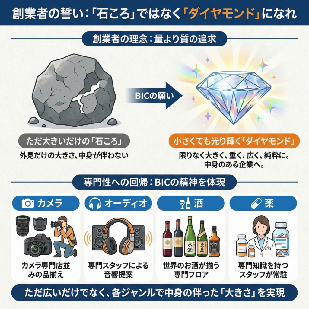 「BIC」という言葉を選んだ背景には、創業者の明確な企業理念が反映されている。それは、「規模」よりも「質」を追求するという、量販店としては逆説的とも言える誓いであった。