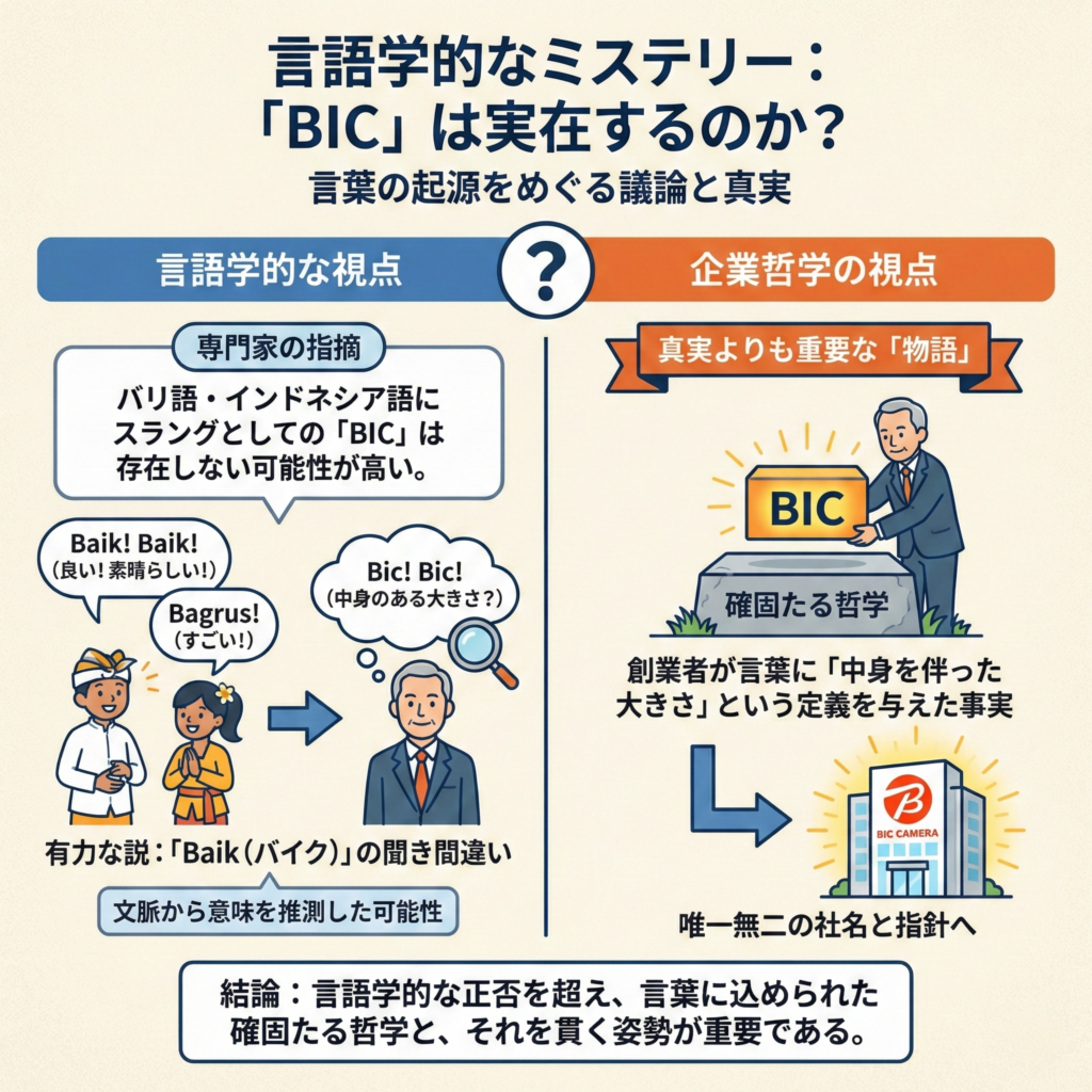 - 実は、言語学者や現地語に詳しい専門家の間では、「バリ語やインドネシア語に『BIC』というスラングは存在しない」という指摘がある。