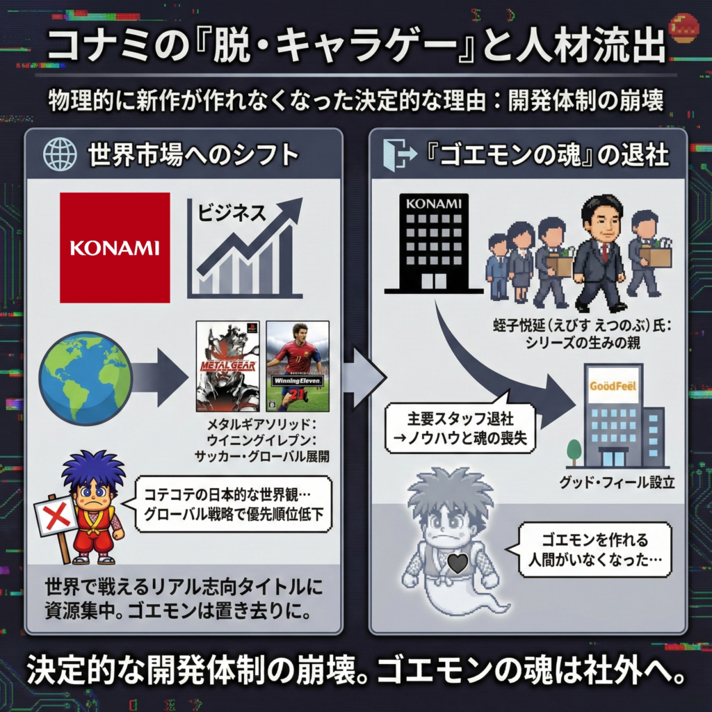 - これにより、コナミ社内には「ゴエモンを作れるノウハウと魂を持った人間」がいなくなってしまったのである。