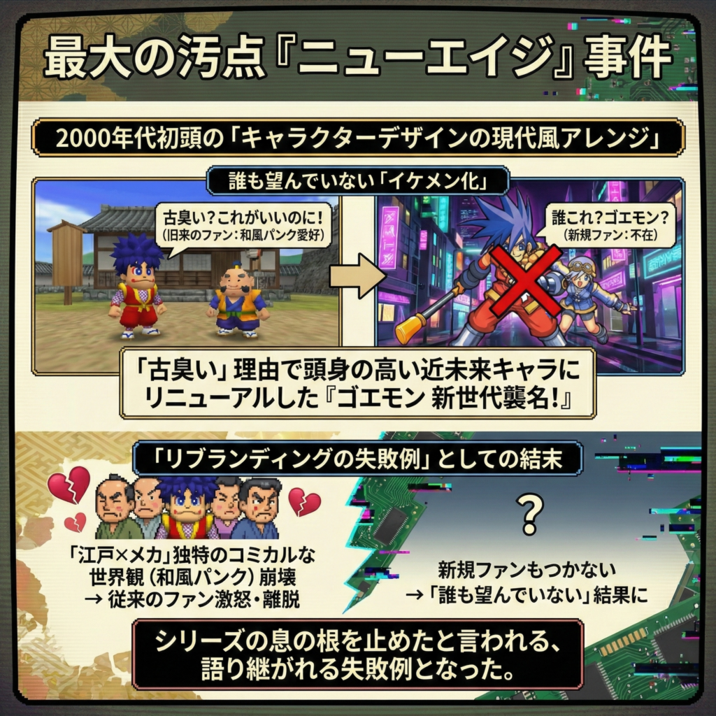 - これが既存ファンから大不評を買った。「江戸×メカ」という独特のコミカルな世界観(和風パンク)が崩壊し、従来のファンが激怒して離れ、新規ファンもつかないという、「リブランディングの失敗例」として語り継がれる結果となった。