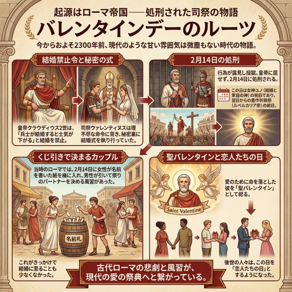 バレンタインデーのルーツは、今からおよそ2300年前のローマ帝国時代にまで遡る。そこには、現代のような甘い雰囲気は微塵もない。