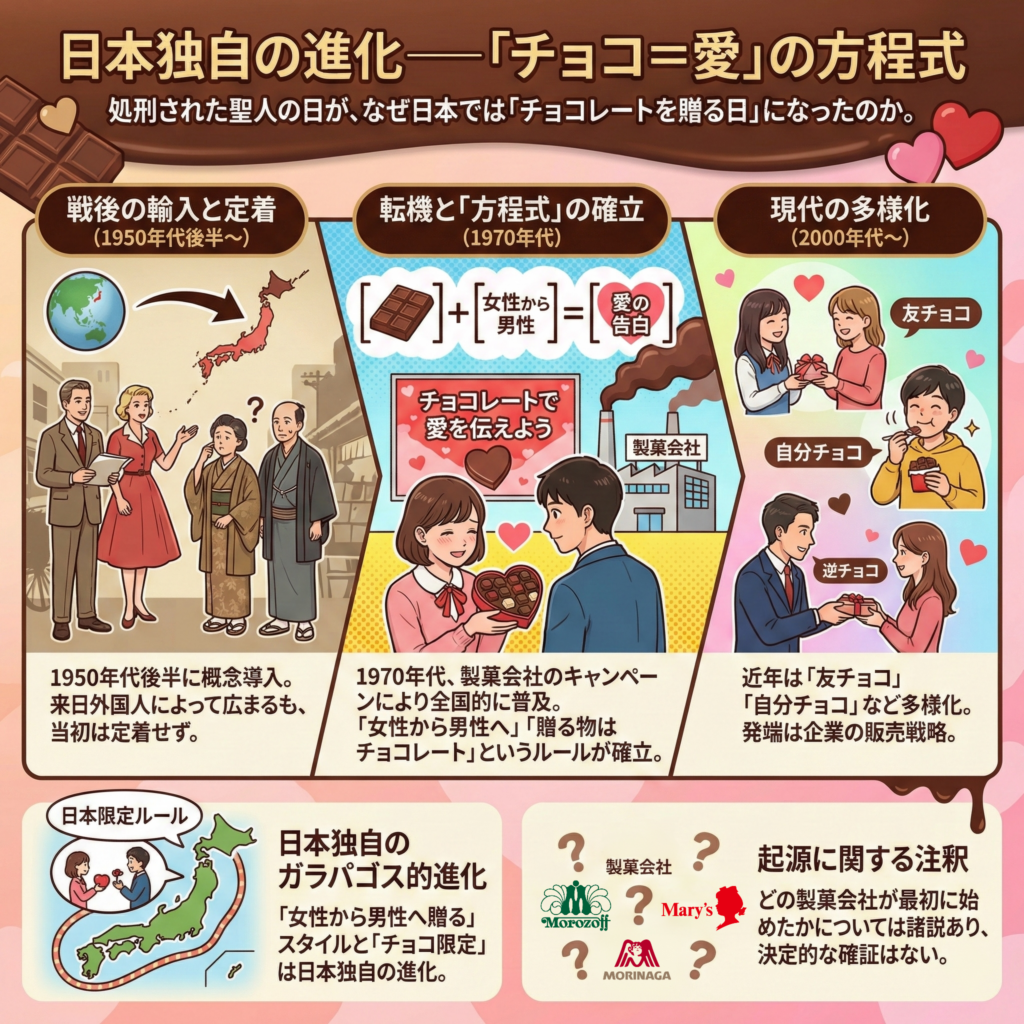 - 転機は1970年代。製菓会社が「チョコレートを渡して愛を告白しよう」というキャンペーンを大々的に展開したことで、全国的に普及した。