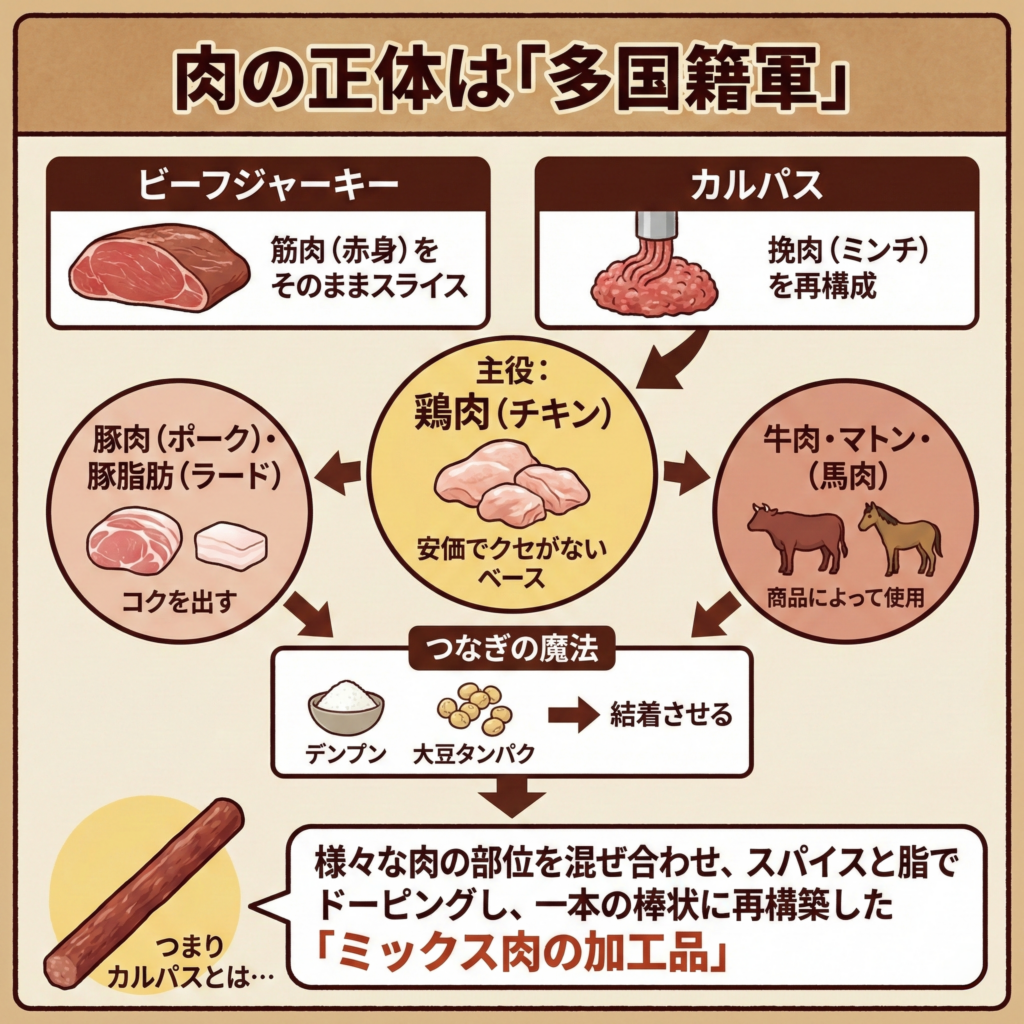 まず、ビーフジャーキーとの決定的な違いは「肉の形状」にある。ジャーキーが筋肉(赤身)をそのままスライスして干したものであるのに対し、カルパスは「挽肉(ミンチ)」を再構成したものだ。では、何の肉なのか?