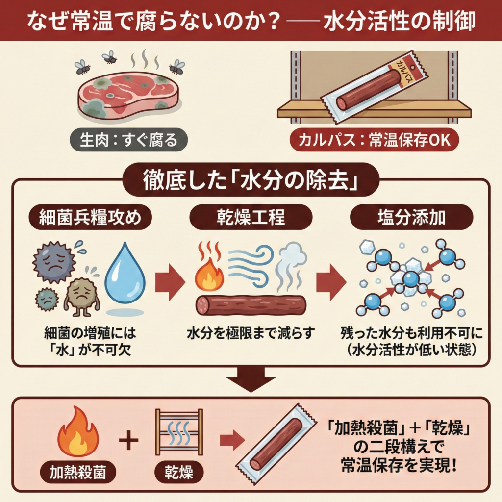 生肉はすぐに腐るが、カルパスは常温で棚に並んでいる。この保存技術の要は、徹底した「水分の除去」にある。