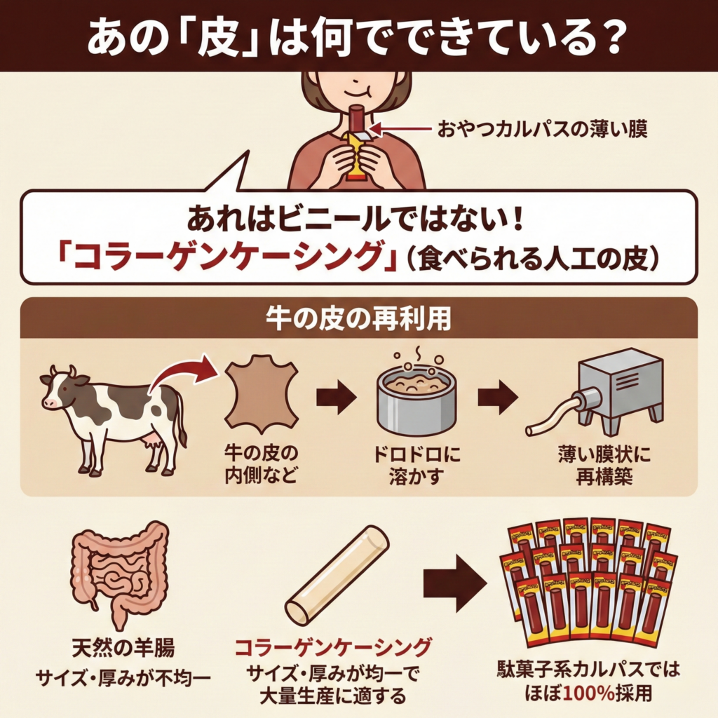 最後に、おやつカルパスなどで「皮ごと」食べているあの薄い膜について。