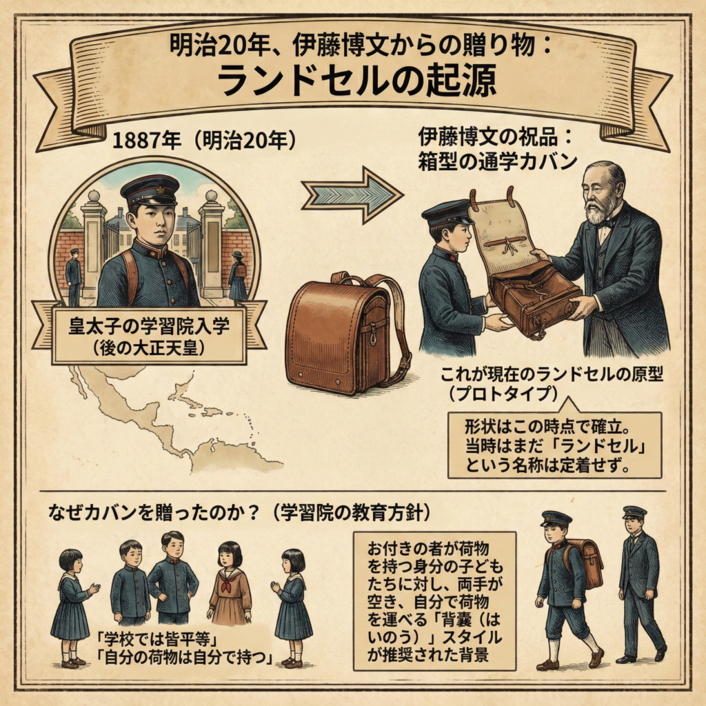 実は、日本で初めてランドセルを背負って通学したのは、後の大正天皇(当時の嘉仁親王)でした。