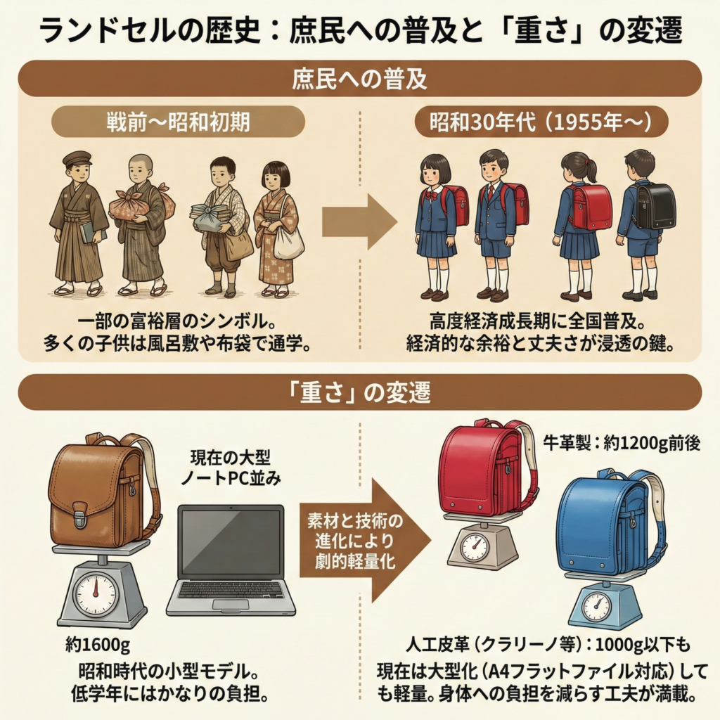 • 普及当時のランドセルは、現在よりも二回りほど小型でしたが、その重量は約1600グラムもありました。これは現在の大型ノートPCを持ち歩くようなもので、当時の低学年の児童にはかなりの負担でした。