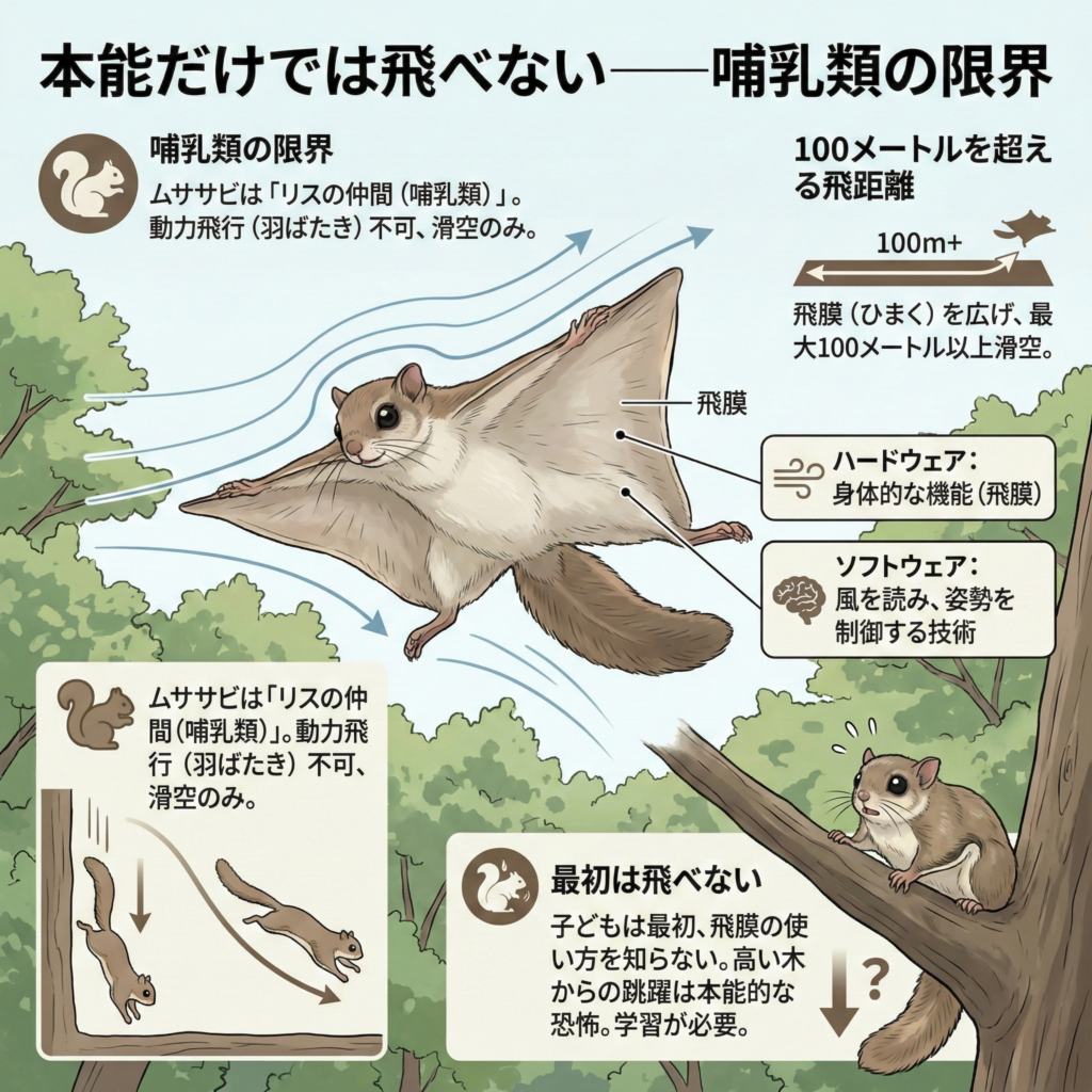 • 魚が泳ぎ方を知っているのとは異なり、ムササビの子どもは最初、飛膜の使い方を知らない。高い木の上から虚空へ身を投げる行為は、本能的な恐怖の対象でしかないのだ。