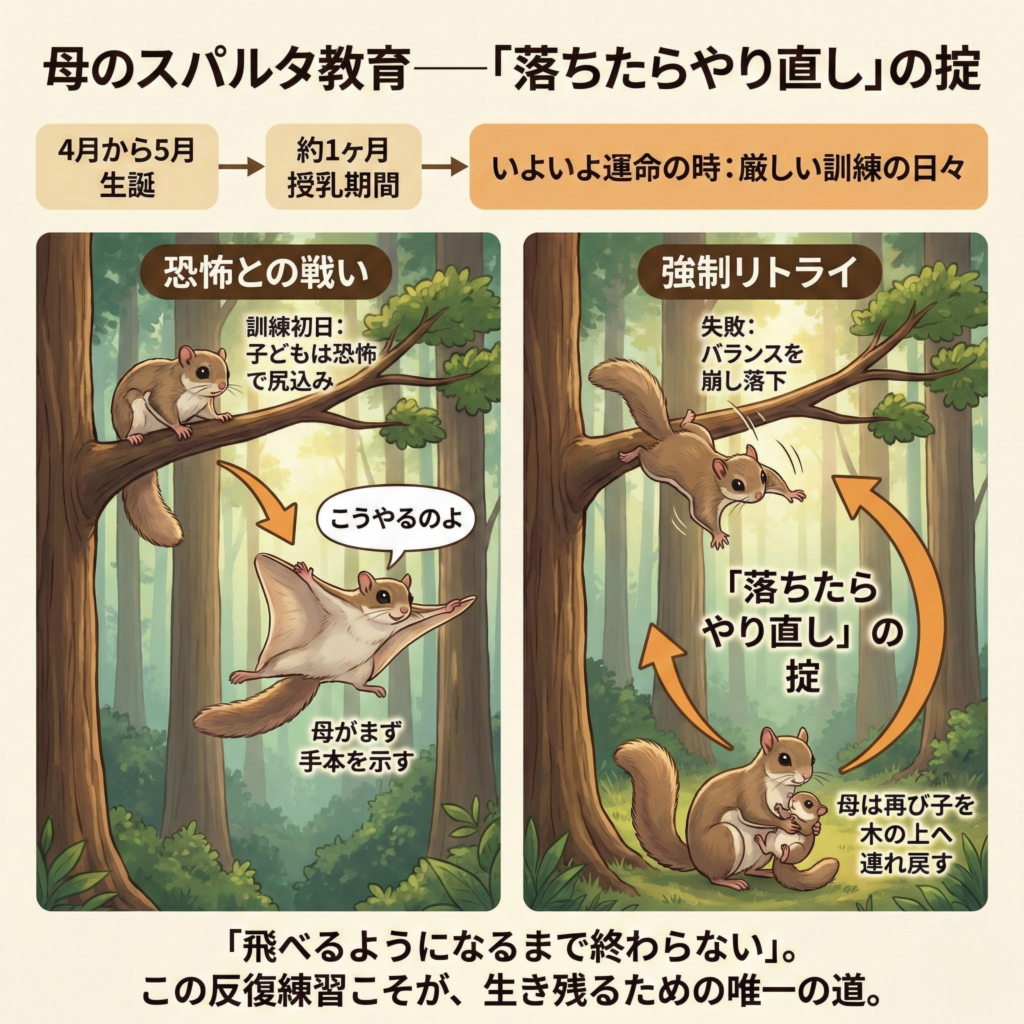 結論として、ムササビの飛行能力は、魔法でも本能の自動発動でもなく、「恐怖を克服した反復練習」の結果であった。