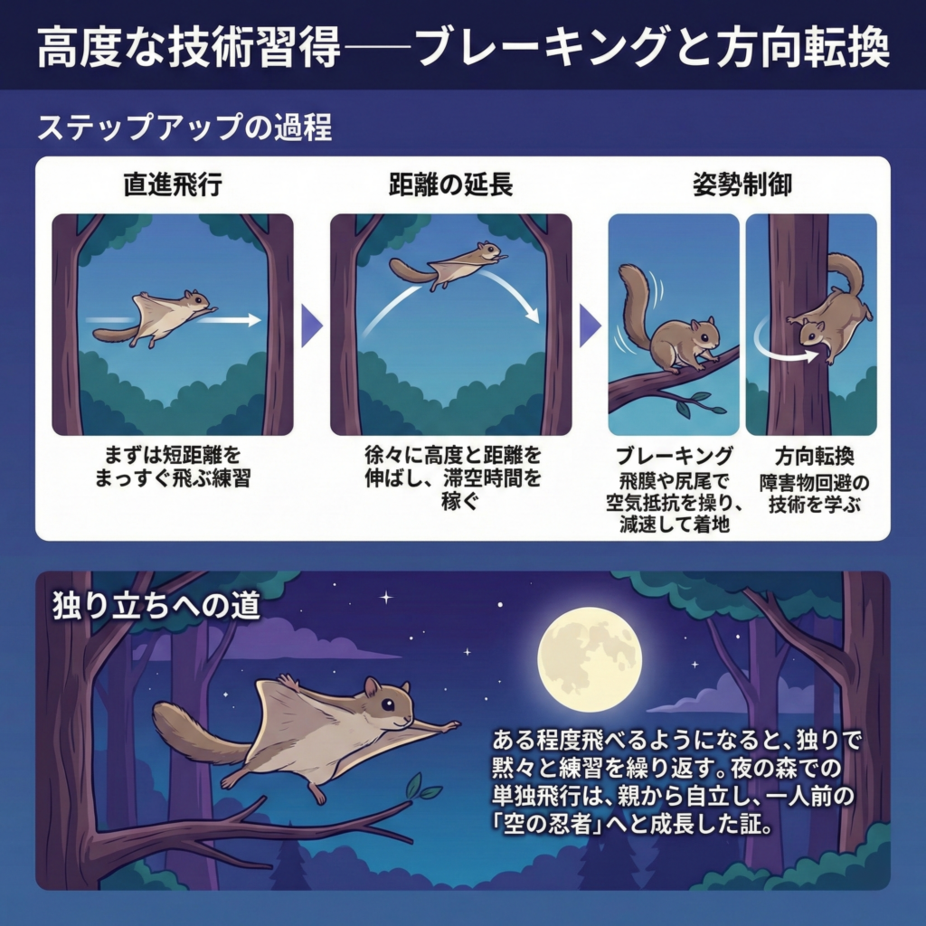 3. 姿勢制御: 最終段階では、飛膜や尻尾を使って空気抵抗を操り、「ブレーキング(減速して着地)」「方向転換(障害物回避)」といった高等テクニックを学ぶ。