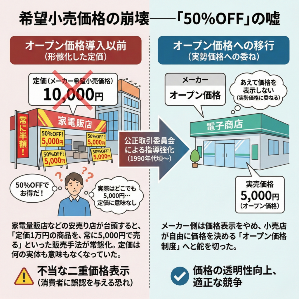 オープン価格の導入は、小売店の現場にも変化をもたらした。それは、「値付けの主導権」がメーカーから小売店(および消費者)へ完全に移行したことを意味する。