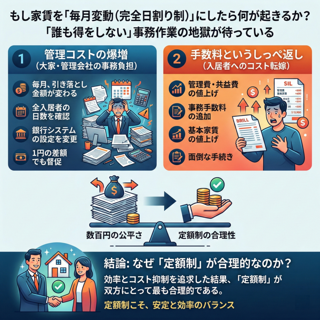 - 「数百円の公平さ」を求めた結果、面倒な手続きと全体的なコスト増を招くため、定額制の方が双方にとって合理的なのである。