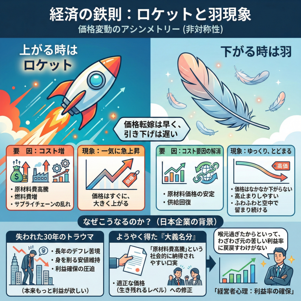 欧米の経済学には、この現象を指す「ロケットと羽(Rockets and Feathers)」という有名な言葉がある。